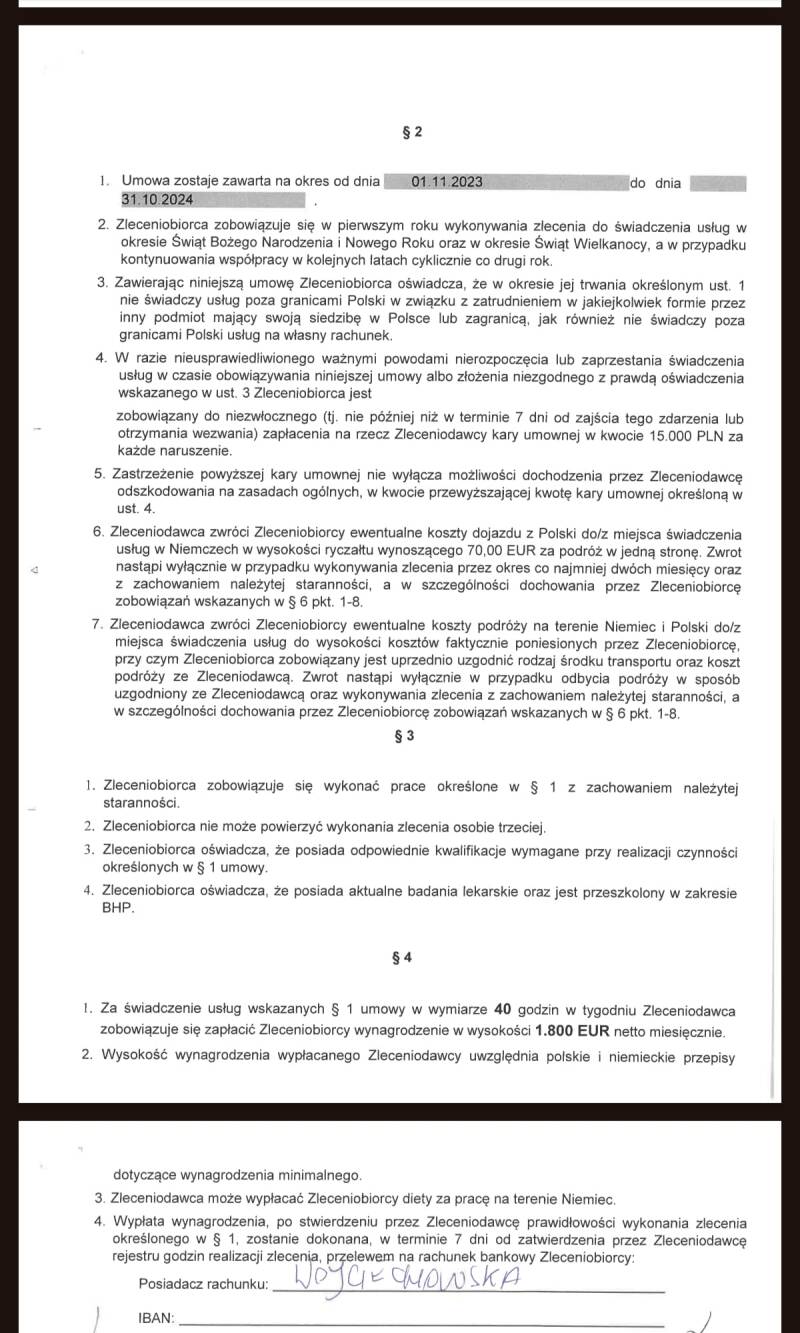 Umowa zlecenia, którą biuro z Warszawy oferuje opiekunkom z całego kraju, jest podpisywana na rok. W dokumencie nie jest jednak zapisane, że pracownik musi przez cały rok pracować. Tymczasem rekruterka wyjaśnia, że ogólnie wygląda to tak: - Dwa miesiące pracy, dwa miesiące przerwy, dwa miesiące pracy… Czyli praktycznie na rocznej umowie pracuje się minimalnie pół roku, przy czym zleceń musi być kilka. W praktyce jest to niewykonalne, bo podopiecznym, w zależności od jego stanu, można opiekować się tydzień lub wiele miesięcy, tudzież lat. Wniosek nasuwa się sam: nie ma możliwości pojechania na jedno zlecenie. Tym bardziej, że w umowie jest zapis o konieczności pracy w święta…
