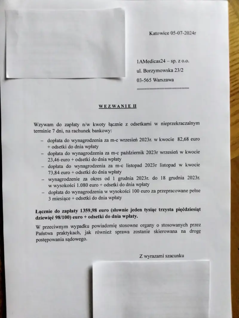 Opiekunka Justyna, jak wiele kobiet jej podobnych, postanowiła pojechać do pracy do Niemiec, aby opiekować się tamtejszymi seniorami. Chciała służyć schorowanym ludziom, a jednocześnie zarobić, podreperować swój budżet. W tym celu podpisała umowę z firmą 1A Medicas 24, obecna Mamma Mia, i wyjechała za Odrę. Gdy dotarła na miejsce, okazało się, że ma pracować dla zupełnie innej firmy, a mianowicie dla firmy 1A Pflegemax 24 z Mannheim. Nie tak się umawiała, pojawiły się więc obawy co do przyszłości. Niestety przeczucie nie myliło opiekunki Justyny. Po pewnym czasie kobieta sprawdziła, czy firma z Warszawy reguluje składki ZUS. Okazało się, że nie. Brak opłat był więc powodem wypowiedzenia umowy. Co zrobiła firma 1A Medicas 24, obecnie Mamma Mia? Nałożyła karę umowną na opiekunkę wynoszącą 15 tys. złotych a na poczet kary zabrano opiekunce całą pensję. Do dnia dzisiejszego ani firma 1A Pflegemax 24, ani 1A Medicas 24 nie poczuwają się do odpowiedzialności. Za nieprawidłowość, za którą same odpowiadają. Mimo dokumentów ZUS... Są jednak świadome tego, co robią. Gdy się bowiem pojawiło więcej opiekunek takich jak Justyna, na rynku pojawiła się nowa firma, Mamma Mia. Ma ona zastąpić poprzedniczkę i jednocześnie pomóc uciec od odpowiedzialności za nieprawidłowości, których się dopuściła firma 1A Medicas 24. Z Warszawy. Z ulicy Borzymowskiej. Uważajcie na tych ludzi. Zwłaszcza na osoby takie jak: Agata H., Iwona L., Wirginia K.