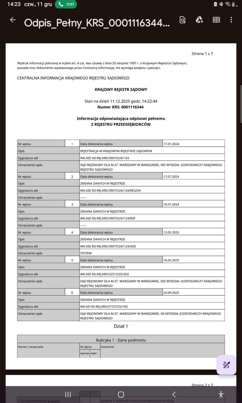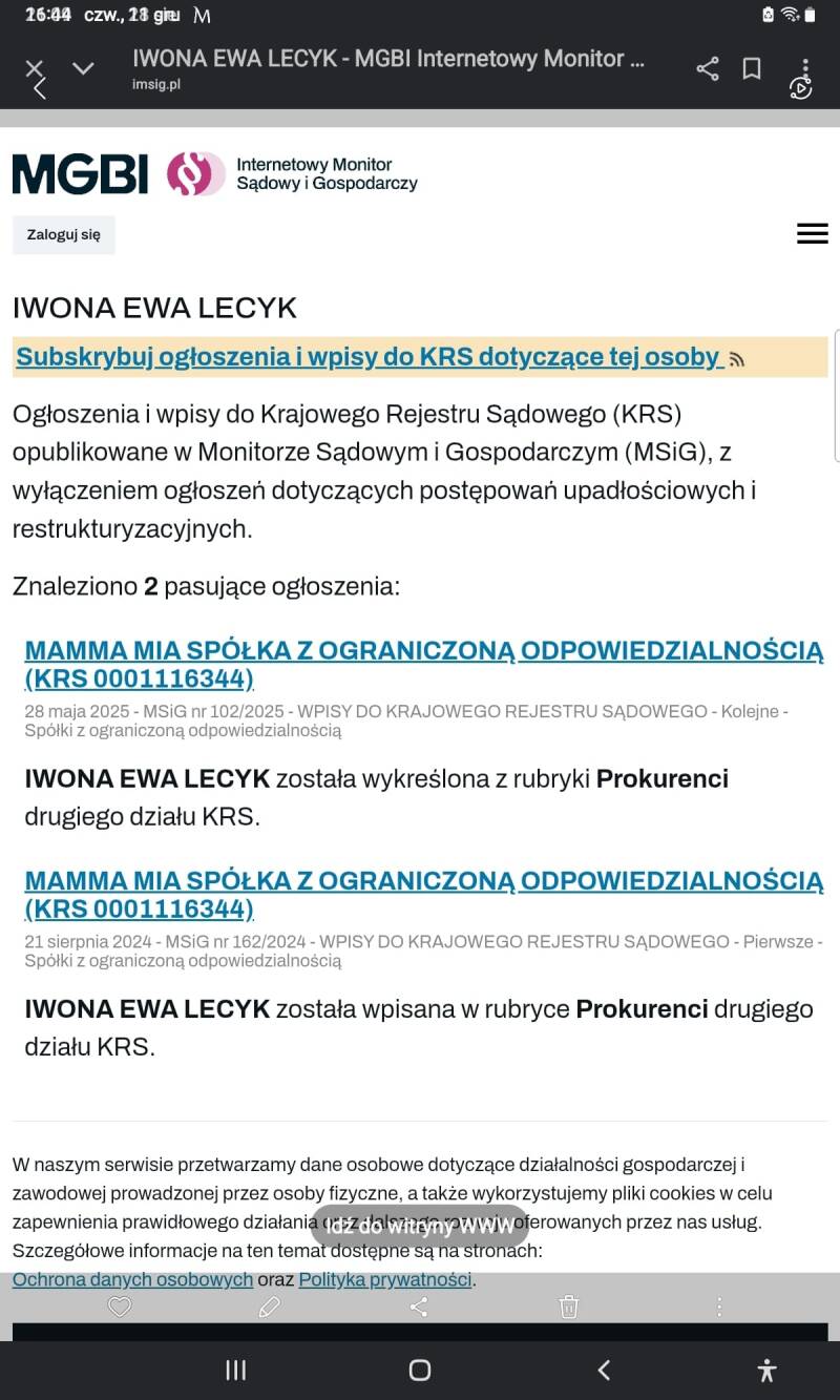 Iwona L., szefowa "agencji opiekunek" 1A Medicas 24 powraca jak bumerang. Ciekawa informacja, najpierw bowiem odchodzi z ważnych powodów... Jakich? Gdy zajrzymy w tekst maila, który dostały "opiekunki", przeczytamy, że w trosce o komfort, bezpieczeństwo danych oraz wyższy standard obsługi, nawiązano współpracę z profesjonalnym biurem rachunkowym. Doprawdy? Dotarło do szefowej, Agaty H., kogo zatrudniła? Czyżby zapoznała się z raportem pokontrolnym Państwowej Inspekcji Pracy, który nie pozostawia wątpliwości, kto za to wszystko odpowiada? Fajnie by było, ale przecież "potknięć" Iwony L. było więcej, otarło się nawet o sąd, gdzie firma 1A Medicas 24 przegrała proces z opiekunką. Dlaczego wówczas nic nie zrobiono? Dlaczego nie zareagowano po kontroli Zakładu Ubezpieczeń Społecznych, który odebrał opiekunkom zaświadczenia A1? Czemu nic nie zrobiono, gdy pojawiły się procesy sądowe przeciwko firmie 1A Medicas 24? Dziwne pokłady tolerancji Agaty H. wobec Iwony L., nieprawdaż? To jednak nie wszystko, otóż wszystkie przewinienia poszły na tyle w zapomnienie, że Iwona L. awansowała na stanowisko prokurenta w nowej firmie Mamma Mia. Czemu powstała? Powyższe informacje zdają się wyjaśniać tę kwestię, zostawmy jej jednak na boku, oto bowiem pojawia się szok. Iwona Lecyk (imię i nazwisko pozyskane ze źródeł oficjalnych) przestaje być prokurentem, a na tym stanowisku zastępuje ją rekruterka z największym stażem pracy w firmie 1A Medicas 24, Wirginia Kruglak (imię i nazwisko pozyskane ze źródeł oficjalnych). Myślicie, że to koniec? Nic bardziej mylnego. Otóż Iwona Lecyk awansuje i po pewnym czasie wraca na stanowisko prokurenta... Odpis z KRS jest z dnia dzisiejszego, tj. z 11 grudnia 2025 roku. Konia z rzędem temu, kto rozszyfruje odejścia i powroty Iwony Lecyk. Gdy ostatnio się widzieliśmy, tłumaczyła, że z Agatą H. nie łączą ją żadne bliskie relacje, poza tym już nie pracuje z tym środowiskiem... Apelowała także do sądu, aby rozprawa przeciwko mnie szybko się zakończyła, z góry zakładając, że wygra. Czyżby niecierpliwość zwyciężyła na tyle, że Iwona Lecyk zapomniała trwać w pozorach...?