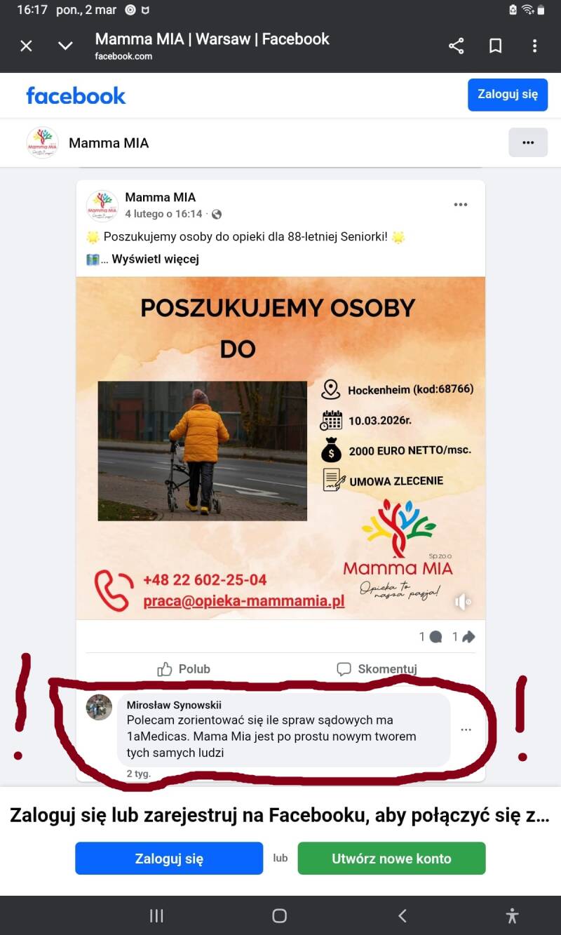 Agencja opiekunek Mamma Mia, dla niewtajemniczonych dawna 1A Medicas 24, za wszelką cenę usiłuje zaistnieć w świadomości opiekunek jako "świeżynka". Tymczasem ciągnie się za tą nową-starą firemką całkiem nieciekawa przeszłość. Składają się na nią nieprawidłowości, które potwierdziła Państwowa Inspekcja Pracy; swoje trzy grosze dorzucił także Zakład Ubezpieczeń Społecznych, ale najwięcej mają do powiedzenia byli pracownicy. Skrzywdzeni. Oszukani. Źle potraktowani. Pani Mirosława Adamczyk wszystkich pokrzywdzonych wrzuca do jednego worka, nazywając "pijakami" i "pijaczkami". Cóż..., to znamienne zachowanie dla ludzi związanych z firmami Agaty Halili, a mianowicie z 1A Medicas 24 i Mamma Mia. - Kto nie z nami, to zły, kto z nami, ten dobry - stara narracja powtarzana do znudzenia. Ja więc też do znudzenia będę przypominać, zanim jednak oświadczenie "pijaczki", lekkie sprostowanie dla Pani Mirosławy Adamczyk. Otóż, kłamać trzeba umieć. Jeszcze się tego nie nauczyliście? Jest Pani związana z firmą Mamma Mia od 2016 roku? Jest Pani pewna? Jeśli tak, to muszę Panią rozczarować, ponieważ wspomniana na Facebooku firma powstała w... 2024 roku. I po co to Pani było?