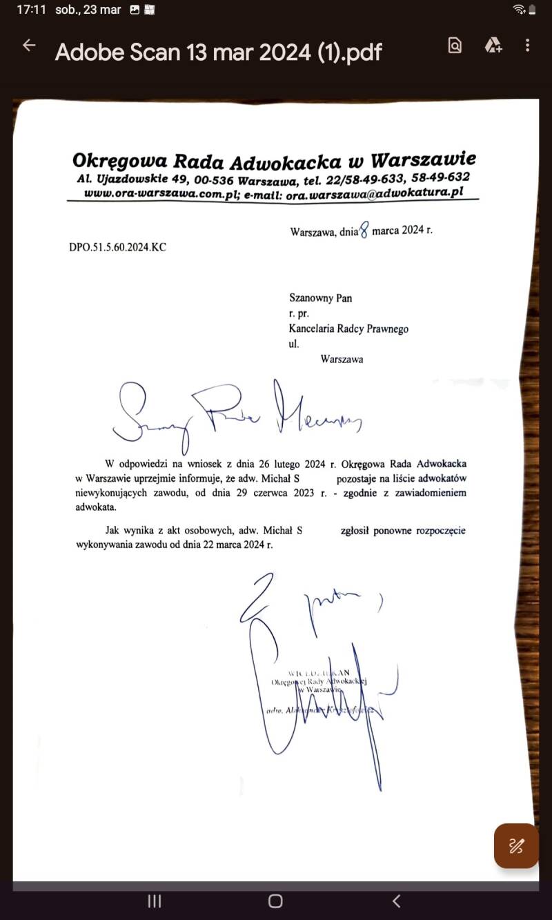 Jedna z pracownic, Alicja W., postanowiła sprawdzić mecenasa w Okręgowej Radzie Adwokackiej. Efekt przeszedł jej najśmielsze oczekiwania. Okazało się, że Michał S. w chwili wysyłania do owej opiekunki oświadczenia o potrąceniu wynagrodzenia (21 lutego 2024 r.), nie był członkiem ORA, o czym zaświadczają poniższe dokumenty. Co więcej, nigdy nie wystąpił na drogę sądową, aby wyegzekwować resztę "zasądzonej" kwoty, co - w mojej ocenie - świadczy o pewnym mechanizmie działania, który dotyczył i innych pracownic opieki.