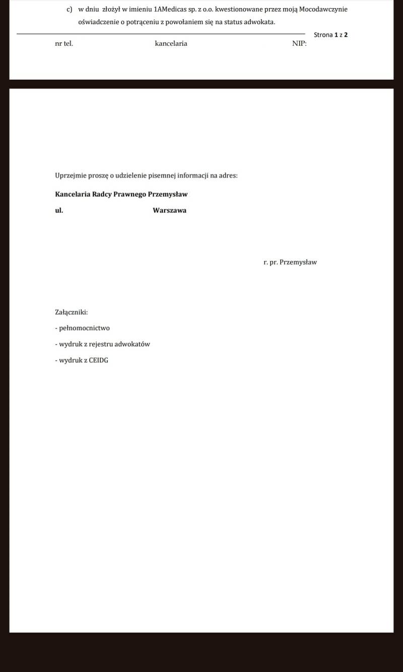 Po co o tym piszę? Ponieważ w mojej ocenie adwokat Michał S., udziałowiec agencji opiekunek 1A Medicas 24, naruszył normy etyczne, jego czyny stanowią uchybienie etyce zawodowej oraz naruszają godność zawodu. Na jakiej podstawie tak uważam? Otóż adwokat Michał S. z upoważnienia właścicielki agencji opiekunek 1A Medicas 24, Agaty H., wysyłał do niektórych opiekunek pisma z informacją o nałożeniu kary, na poczet której była zabierana cała pensja. Pisma były opatrzone określeniami typu "kancelaria adwokacka", "adwokat", "wezwanie do zapłaty", co mogło sprawiać określone wrażenie i wywierać presje na osoby, które nie są świadome faktów prawniczych.