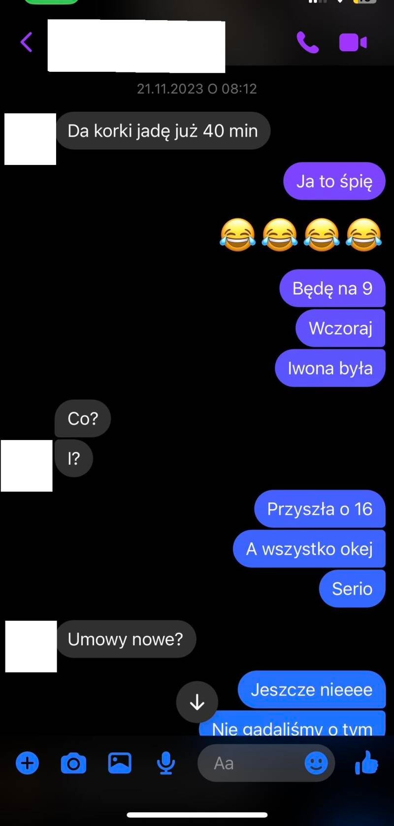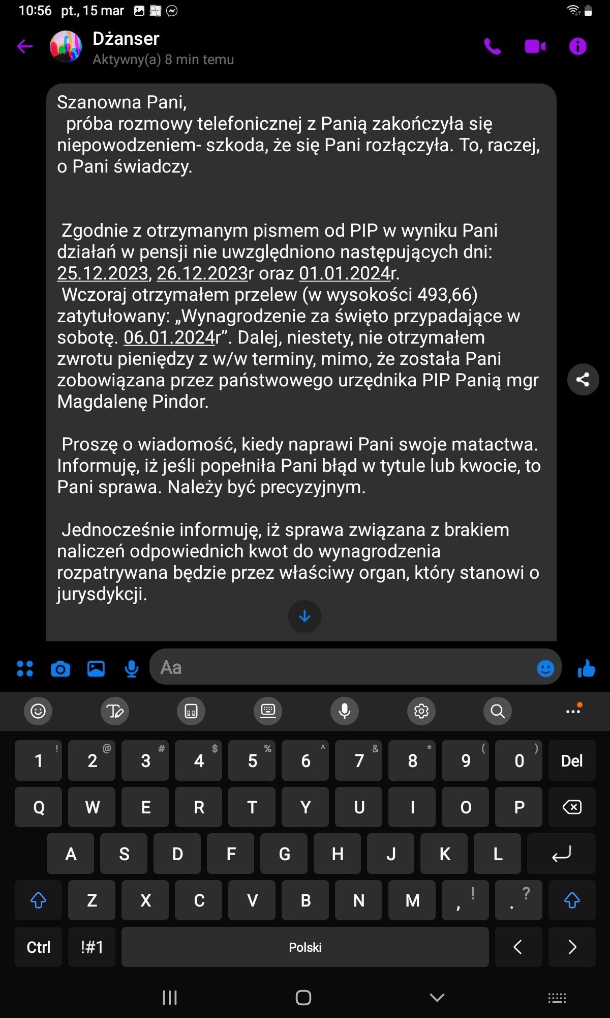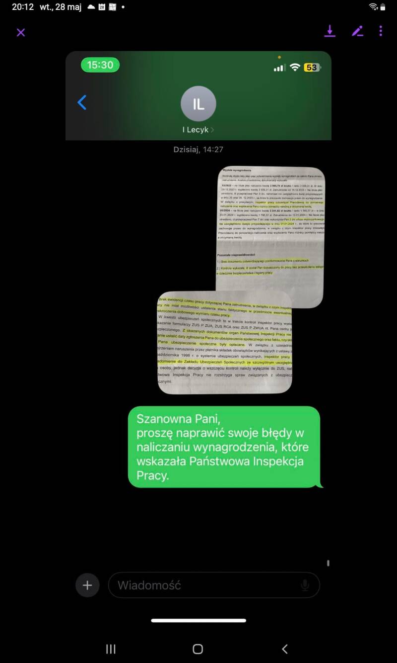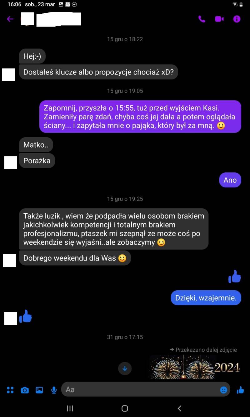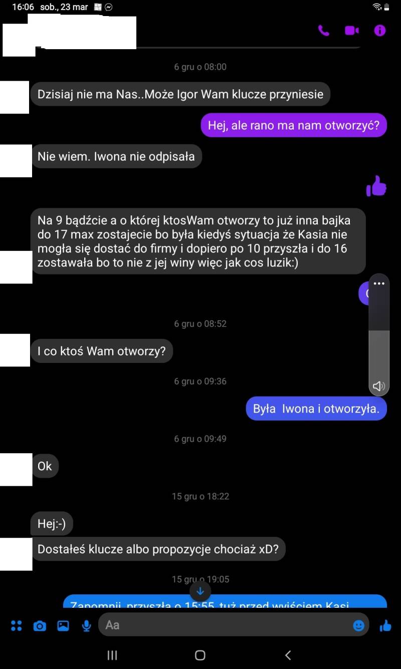 PS. Parę niewygodnych faktów. Iwona L., kierowniczka biura, podczas mojej obecności w firmie była na zwolnieniu lekarskim. Podobno kilka tygodni. Screeny jednoznacznie wskazują, że była w pracy 6 grudnia (piszę o tym o godzinie 9:36, pracę zaś zaczynałem o 9.00...). Kolejne daty, kiedy jest mowa o Iwonie L., to 20 listopada i 15 grudnia. Kiedy więc to zwolnienie lekarskie? Co więcej, podobno mam urojenia co do wyjazdu do Niemiec, skąd zatem rozmowa o podróży 26 listopada? Przypominam, że umowę o pracę na czas nieokreślony podpisałem dopiero 12 grudnia. Wniosek z tego prosty - rozmowa o wyjeździe do Niemiec toczyła się podczas okresu próbnego. I w tym czasie była planowana.