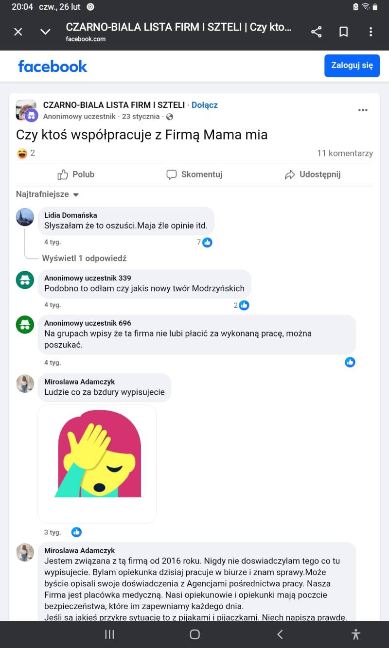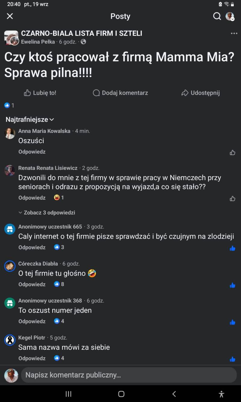 Agencja opiekunek Mamma MIA (dawna 1A Medicas 24) ma wiele negatywnych opinii wśród opiekunek i opiekunów. Ludzie zarzucają tej firmie wiele, zbyt dużo, o czym informują się i innych. Poniżej dowody. Dziś jednak nie o tym, a o pewnym mechanizmie socjotechnicznym. Jak zachęcić innych do siebie? Jak przekonać, że nas lubią i wielu chce u nas pracować? Skoro tłumy się nie ustawiają, trzeba wymyślić jakiś wabik. Jest nim "sztuczny tłum", tak więc jak grzyby po deszczu pojawiają się ci, co popierają i zachęcają. "Lajkują" na rzecz firmy, czasem coś napiszą. Zdarza się, że rozmawiają na prywatnych portalach dla... gejów. Nie, nie jestem żadnym fobem, chodzi o to, że KŁAMIĄ. Nie znają człowieka, a oczerniają go, wypowiadając się na tematy, o których nie mają bladego pojęcia. Poniżej dowód w postaci raportu pokontrolnego Państwowej Inspekcji Pracy. Szkopuł w tym, że to sami pracownicy Mamma MIA (dawna 1A Medicas 24) lub pracownicy 1A Pflegemax 24, czyli firmy, dla której de facto pracują opiekunki i opiekunowie z Polski. Poniżej dowody.