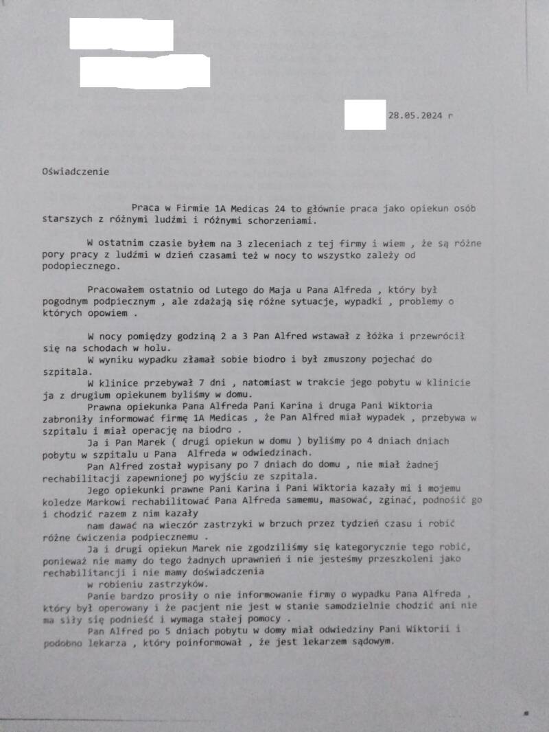 Opiekunka Justyna i opiekun Darek potwierdzają w swoich oświadczeniach, że pracując dla agencji opiekunek 1A Medicas 24 z Warszawy, wykonywali obowiązki powyżej 8 godzin dziennie. O powszechnych nadgodzinach mówi również wieloletni pracownik firmy 1A Pflegemax 24 z Mannheim, Tomek. Pracował tam od 2015 roku, więc gdy mówi, że każdy rekruter kłamie, nie mam powodów mu nie wierzyć. Zresztą jego zeznania pokrywają się z wypowiedziami wielu pokrzywdzonych opiekunek i opiekunów. O tym, że na przykład miejsce pracy nie zgadzało się z tym, o czym opowiadali rekruterzy, mówi opiekunka Renata.